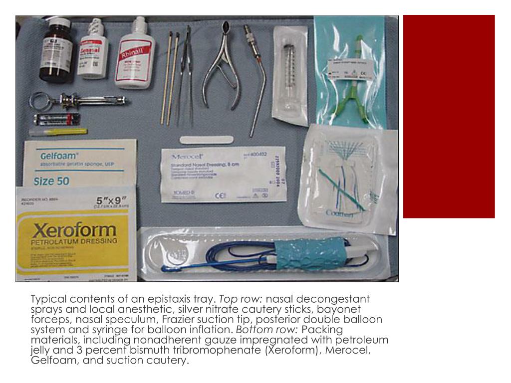 Typical contents of an epistaxis tray. Top row: nasal decongestant sprays and local anesthetic, silver nitrate cautery sticks, bayonet forceps, nasal speculum, Frazier suction tip, posterior double balloon system and syringe for balloon inflation. Bottom row: Packing materials, including nonadherent gauze impregnated with petroleum jelly and 3 percent bismuth tribromophenate (Xeroform), Merocel, Gelfoam, and suction cautery.