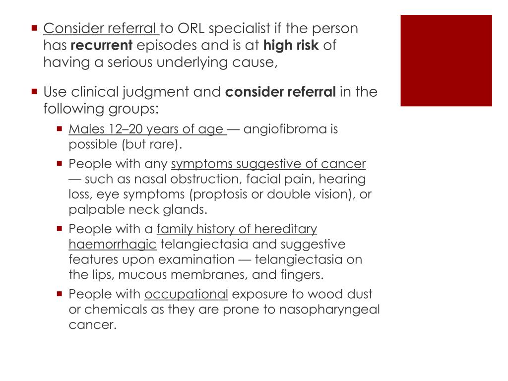 Consider referral to ORL specialist if the person has recurrent episodes and is at high risk of having a serious underlying cause, • Use clinical judgment and consider referral in the following groups: • Males 12–20 years of age — angiofibroma is possible (but rare). • People with any symptoms suggestive of cancer — such as nasal obstruction, facial pain, hearing loss, eye symptoms (proptosis or double vision), or palpable neck glands. • People with a family history of hereditary haemorrhagic telangiectasia and suggestive features upon examination — telangiectasia on the lips, mucous membranes, and fingers. • People with occupational exposure to wood dust or chemicals as they are prone to nasopharyngeal cancer.