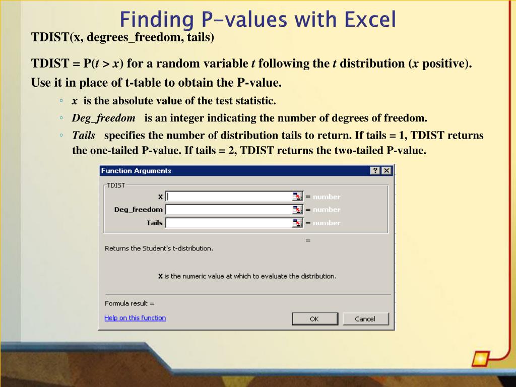 Finding P-values with Excel TDIST(x, degrees_freedom, tails) TDIST = P(t > x) for a random variable t following the t distribution (x positive).Use it in place of t-table to obtain the P-value. • x is the absolute value of the test statistic. • Deg_freedom is an integer indicating the number of degrees of freedom. • Tails specifies the number of distribution tails to return. If tails = 1, TDIST returns the one-tailed P-value. If tails = 2, TDIST returns the two-tailed P-value.