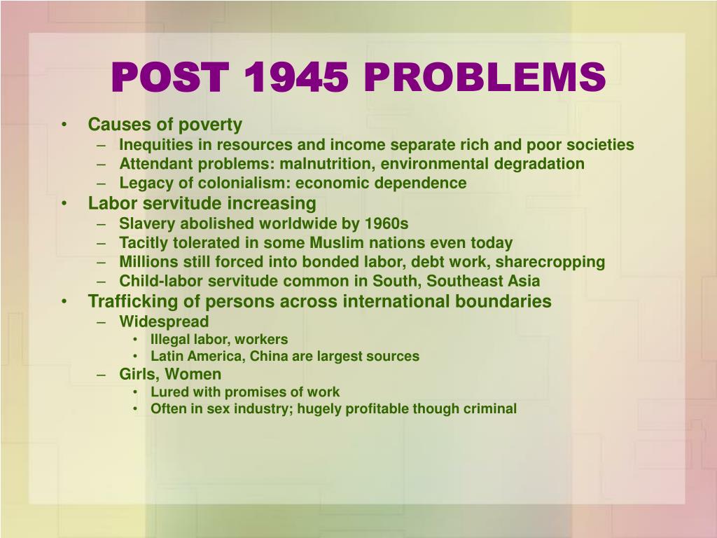 POST 1945 PROBLEMS • Causes of poverty • Inequities in resources and income separate rich and poor societies • Attendant problems: malnutrition, environmental degradation • Legacy of colonialism: economic dependence • Labor servitude increasing • Slavery abolished worldwide by 1960s • Tacitly tolerated in some Muslim nations even today • Millions still forced into bonded labor, debt work, sharecropping • Child-labor servitude common in South, Southeast Asia • Trafficking of persons across international boundaries • Widespread • Illegal labor, workers • Latin America, China are largest sources • Girls, Women • Lured with promises of work • Often in sex industry; hugely profitable though criminal