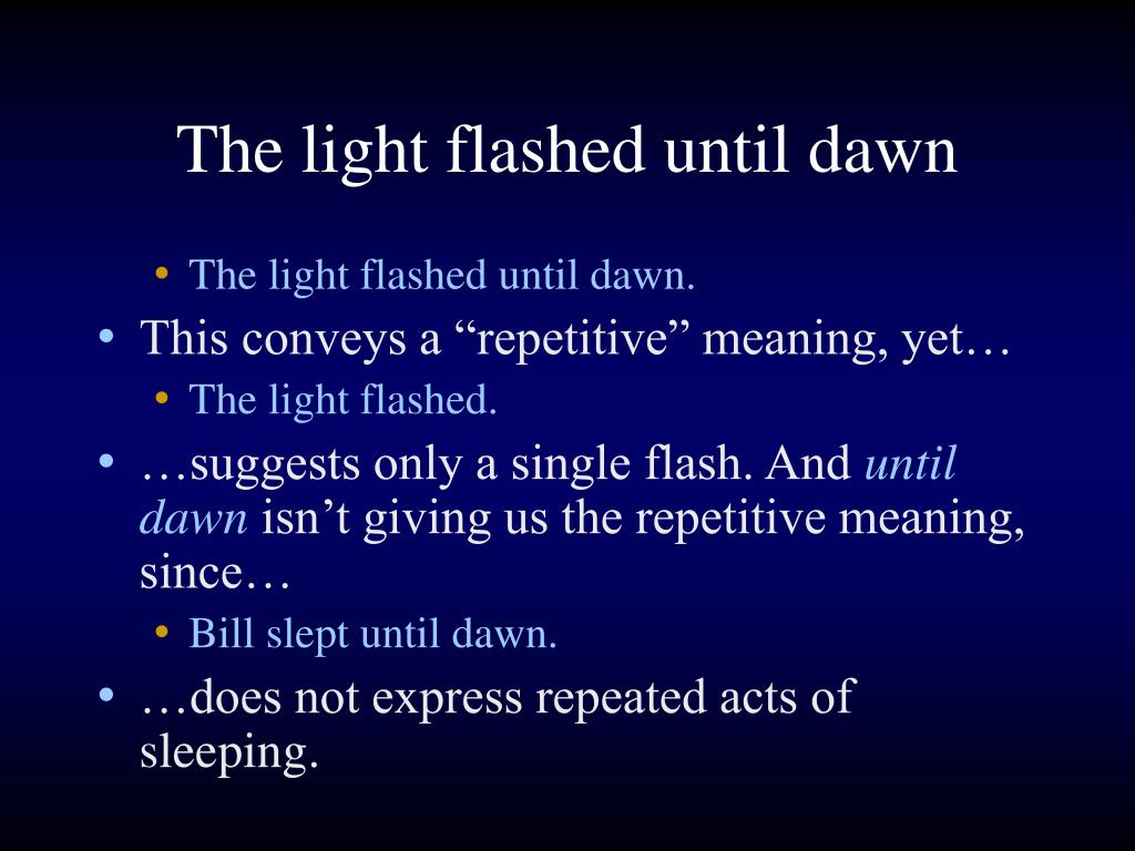The light flashed until dawn • The light flashed until dawn. • This conveys a “repetitive” meaning, yet… • The light flashed. • …suggests only a single flash. And until dawn isn’t giving us the repetitive meaning, since… • Bill slept until dawn. • …does not express repeated acts of sleeping.