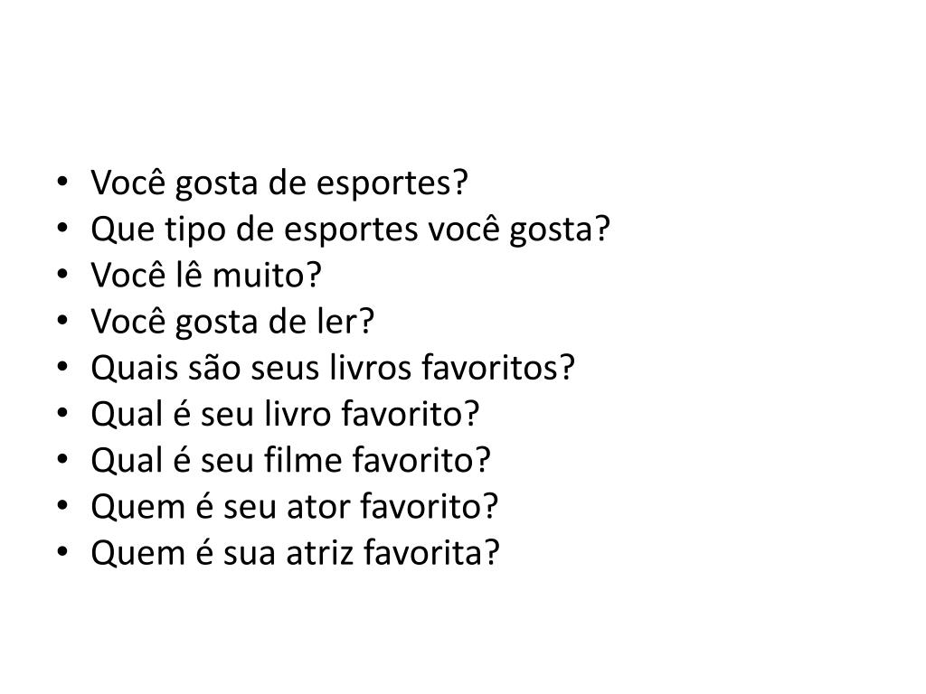 Você gosta de esportes? • Que tipo de esportes você gosta? • Você lê muito? • Você gosta de ler? • Quais são seus livros favoritos? • Qual é seu livro favorito? • Qual é seu filme favorito? • Quem é seu ator favorito? • Quem é sua atriz favorita?