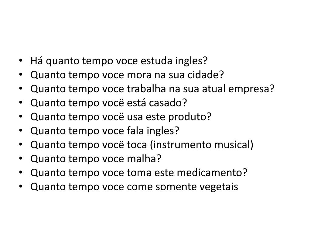 Háquanto tempo voce estuda ingles? • Quanto tempo voce moranasuacidade? • Quanto tempo voce trabalhanasuaatualempresa? • Quanto tempo vocëestácasado? • Quanto tempo vocëusaesteproduto? • Quanto tempo voce fala ingles? • Quanto tempo vocëtoca (instrumento musical) • Quanto tempo voce malha? • Quanto tempo voce tomaestemedicamento? • Quanto tempo voce come somentevegetais