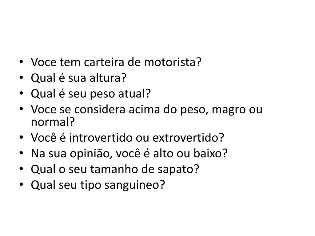 Voce tem carteira de motorista? • Qual é sua altura? • Qual é seu peso atual? • Voce se considera acima do peso, magro ou normal? • Você é introvertido ou extrovertido? • Na sua opinião, você é alto ou baixo? • Qual o seu tamanho de sapato? • Qual seu tipo sanguineo?