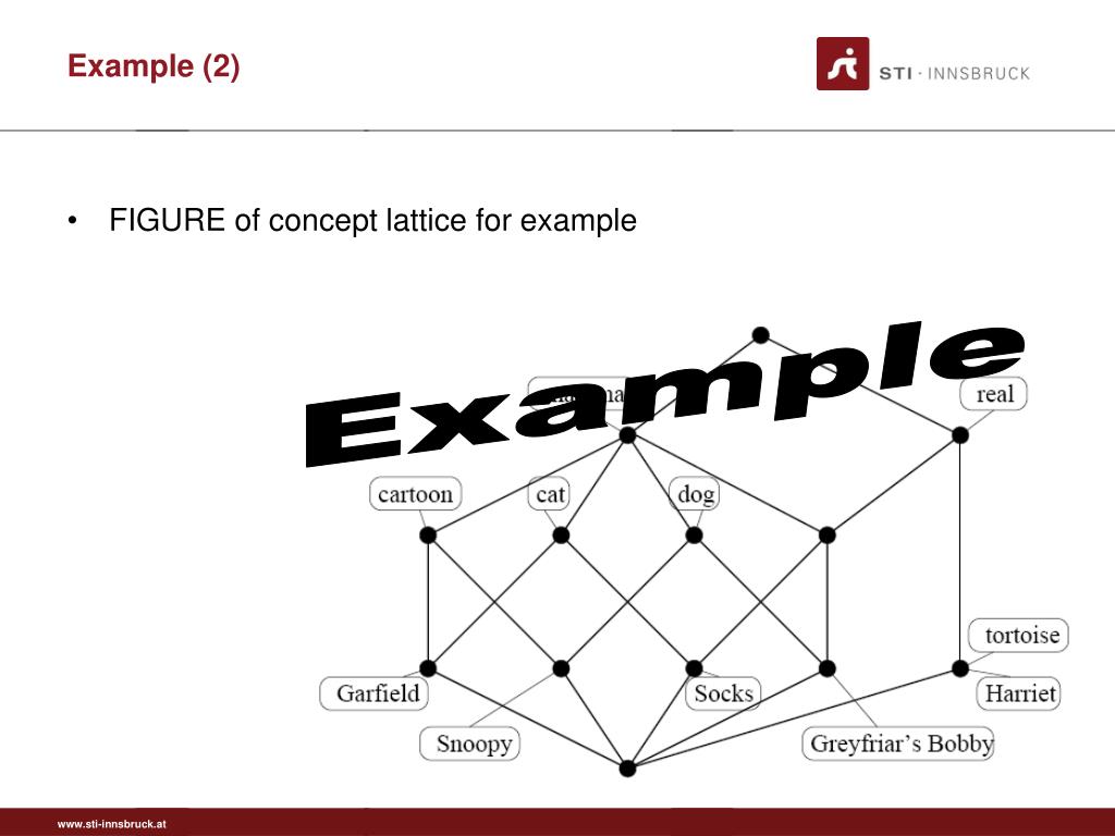 Example • G = {Garfield, Snoopy, Flipper, HUND, Nemo} • M = {cartoon, real, dog, mammal} • B(G,M,I) = { (Ø,{cartoon,real,dog,mammal}), (Snoopy, {cartoon, dog, mammal}), (HUND, {real, dog, mammal}), ({Snoopy,HUND},{dog,mammal}), ({Garfield,Snoopy,Nemo}, cartoon), ({Flipper,HUND},{real,mammal}), ... ({Garfield,Snoopy,Flipper, HUND, Nemo},Ø)}