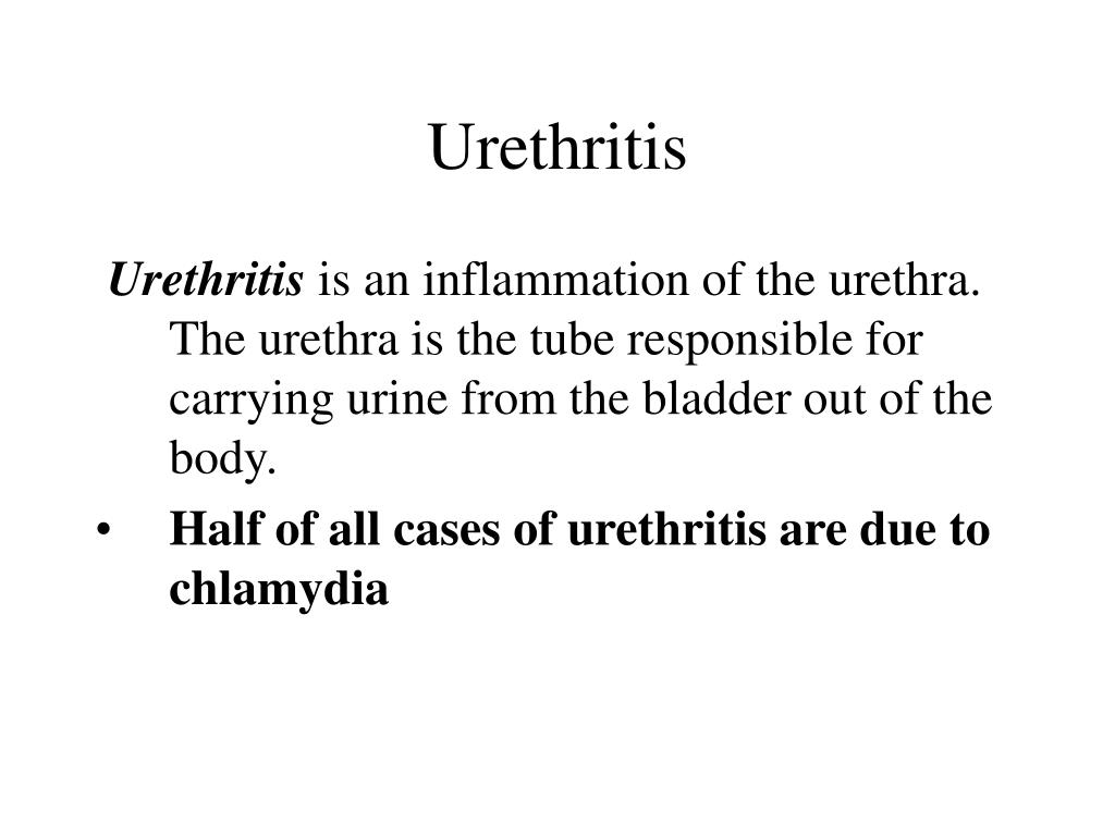 Urethritis Urethritis is an inflammation of the urethra. The urethra is the tube responsible for carrying urine from the bladder out of the body. • Half of all cases of urethritis are due to chlamydia