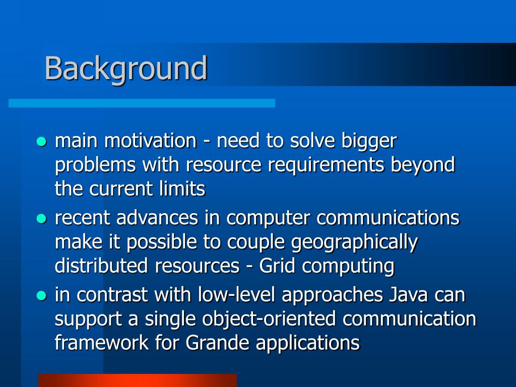 Background • main motivation - need to solve bigger problems with resource requirements beyond the current limits • recent advances in computer communications make it possible to couple geographically distributed resources - Grid computing • in contrast with low-level approaches Java can support a single object-oriented communication framework for Grande applications