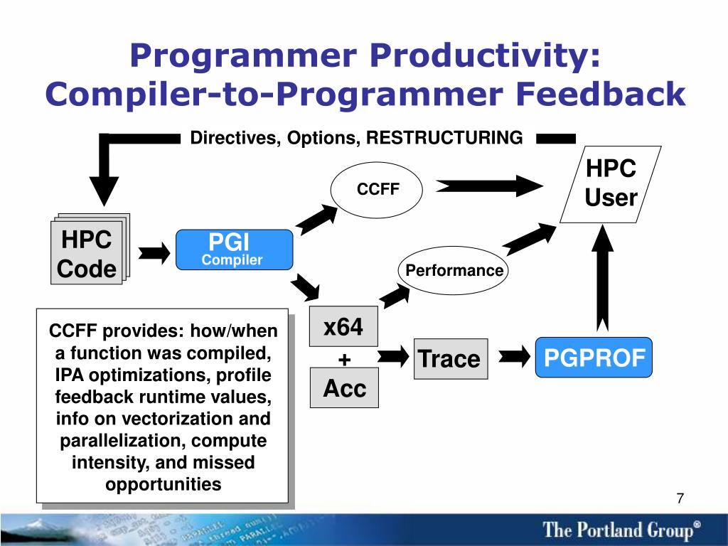 Programmer Productivity: Compiler-to-Programmer Feedback Directives, Options, RESTRUCTURING HPCUser CCFF HPCCode PGI Compiler Performance x64 CCFF provides:how/when a function was compiled, IPA optimizations, profile feedback runtime values, info on vectorization and parallelization, compute intensity, and missed opportunities + PGPROF Trace Acc