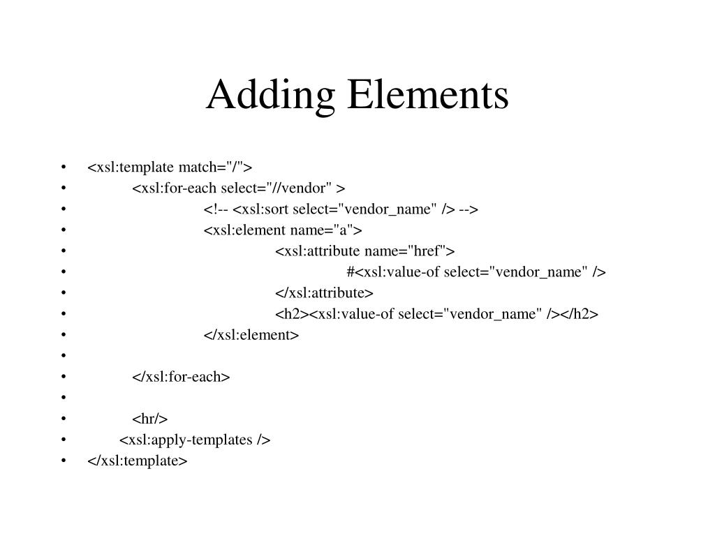 Adding Elements • <xsl:template match="/"> • <xsl:for-each select="//vendor" > • <!-- <xsl:sort select="vendor_name" /> --> • <xsl:element name="a"> • <xsl:attribute name="href"> • #<xsl:value-of select="vendor_name" /> • </xsl:attribute> • <h2><xsl:value-of select="vendor_name" /></h2> • </xsl:element> • </xsl:for-each> • <hr/> • <xsl:apply-templates /> • </xsl:template>