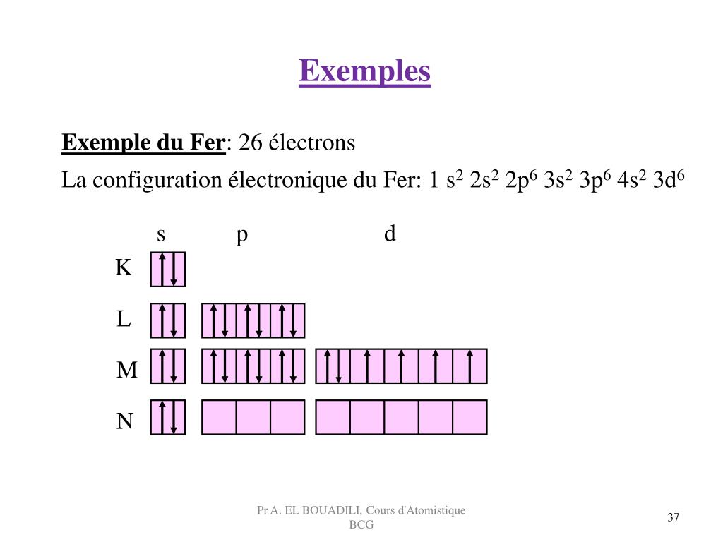 Exemples Exemple du Fer: 26 électrons La configuration électronique du Fer: 1 s2 2s2 2p6 3s2 3p6 4s2 3d6 s p d K L M N Pr A. EL BOUADILI, Cours d'Atomistique BCG