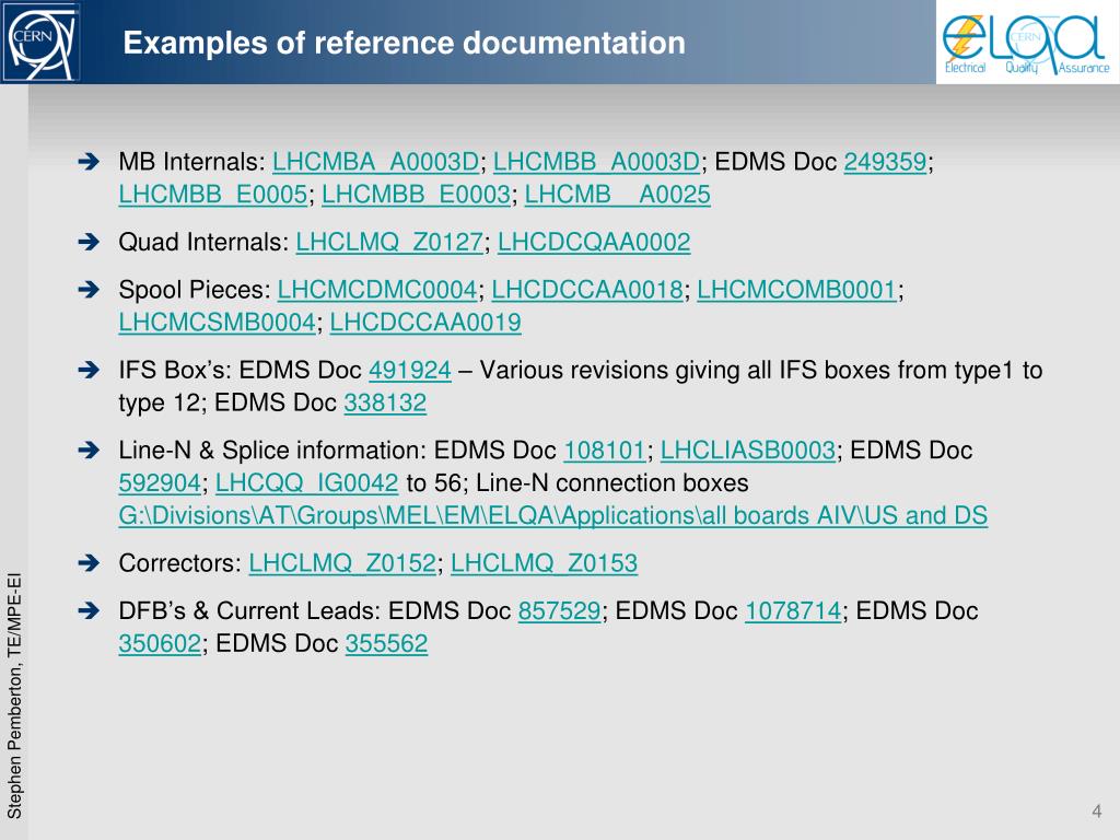Examples of reference documentation • MB Internals: LHCMBA_A0003D; LHCMBB_A0003D; EDMS Doc 249359; LHCMBB_E0005; LHCMBB_E0003; LHCMB__A0025 • Quad Internals: LHCLMQ_Z0127; LHCDCQAA0002 • Spool Pieces: LHCMCDMC0004; LHCDCCAA0018; LHCMCOMB0001; LHCMCSMB0004; LHCDCCAA0019 • IFS Box’s: EDMS Doc 491924 – Various revisions giving all IFS boxes from type1 to type 12; EDMS Doc 338132 • Line-N & Splice information: EDMS Doc 108101; LHCLIASB0003; EDMS Doc 592904; LHCQQ_IG0042 to 56; Line-N connection boxes G:\Divisions\AT\Groups\MEL\EM\ELQA\Applications\all boards AIV\US and DS • Correctors: LHCLMQ_Z0152; LHCLMQ_Z0153 • DFB’s & Current Leads: EDMS Doc 857529; EDMS Doc 1078714; EDMS Doc 350602; EDMS Doc 355562
