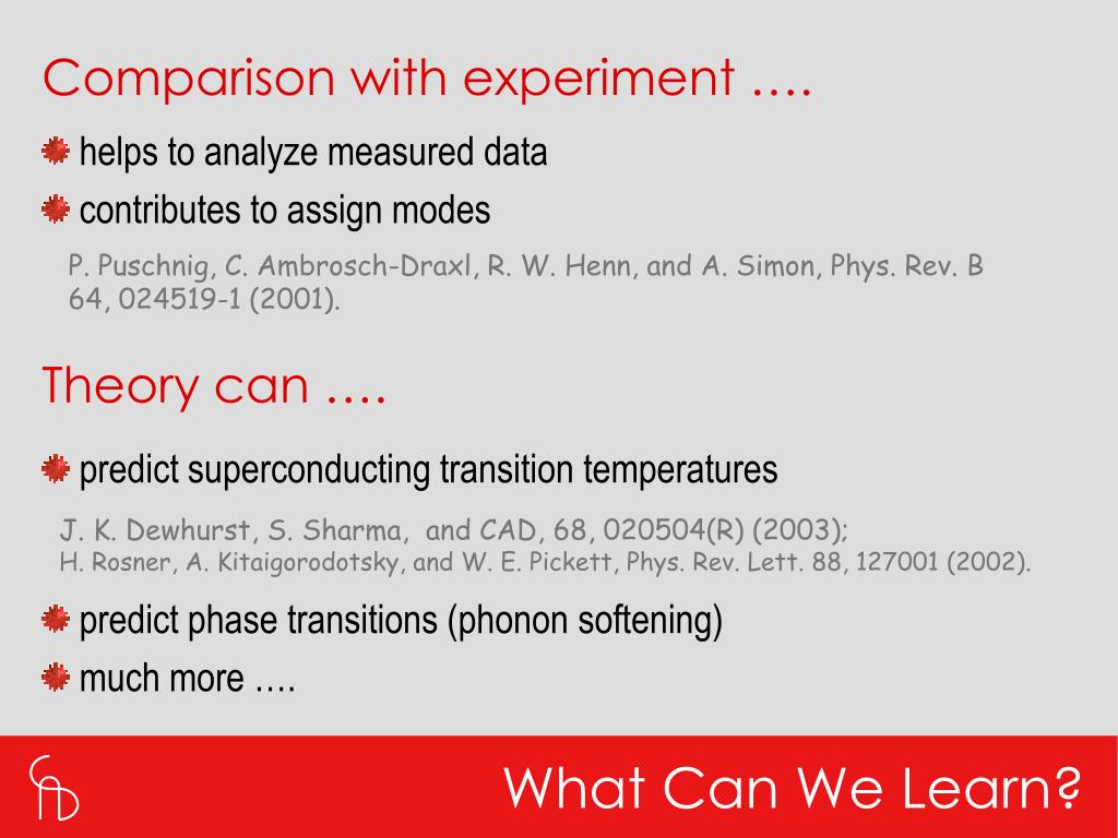 Comparison with experiment …. • helps to analyze measured data • contributes to assign modes P. Puschnig, C. Ambrosch-Draxl, R. W. Henn, and A. Simon, Phys. Rev. B 64, 024519-1 (2001). Theory can …. • predict superconducting transition temperatures J. K. Dewhurst, S. Sharma, and CAD, 68, 020504(R) (2003);H. Rosner, A. Kitaigorodotsky, and W. E. Pickett, Phys. Rev. Lett. 88, 127001 (2002). • predict phase transitions (phonon softening) • much more …. What Can We Learn?