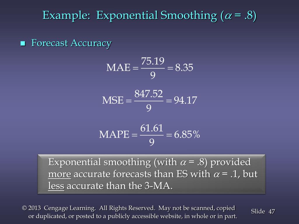 Example: Exponential Smoothing (a = .1) • Forecast Accuracy Exponential smoothing (with a = .1) provided less accurate forecasts than the 3-MA approach.