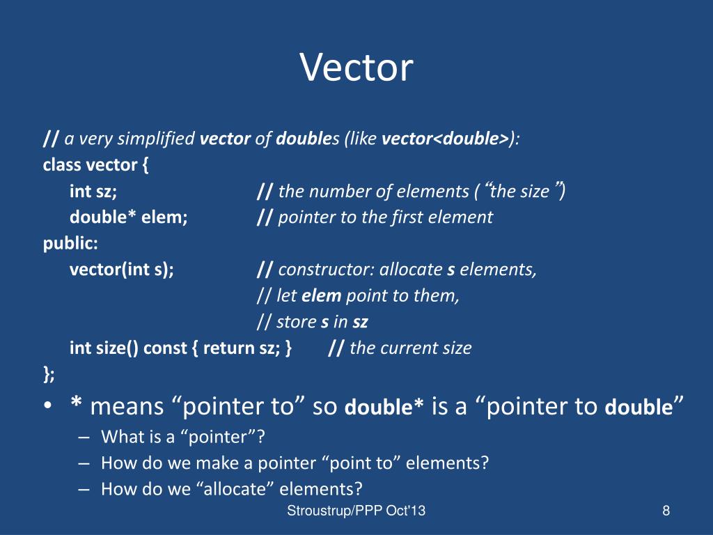 Vector // a very simplified vector of doubles (like vector<double>): class vector { int sz; // the number of elements (“the size”) double* elem; // pointer to the first element public: vector(int s); // constructor: allocate s elements, // letelempoint to them, // store s in sz int size() const { return sz; } // the current size }; • * means “pointer to” sodouble*is a “pointer todouble” • What is a “pointer”? • How do we make a pointer “point to” elements? • How do we “allocate” elements? Stroustrup/PPP Oct'13