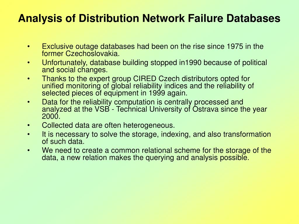 Analysis of Distribution Network Failure Databases Exclusive outage databases had been on the rise since 1975 in the former Czechoslovakia. Unfortunately, database building stopped in1990 because of political and social changes. Thanks to the expert group CIRED Czech distributors opted for unified monitoring of global reliability indices and the reliability of selected pieces of equipment in 1999 again. Data for the reliability computation is centrally processed and analyzed at the VSB - Technical University of Ostrava since the year 2000. Collected data are often heterogeneous. It is necessary to solve the storage, indexing, and also transformation of such data. We need to create a common relational scheme for the storage of the data, a new relation makes the querying and analysis possible.