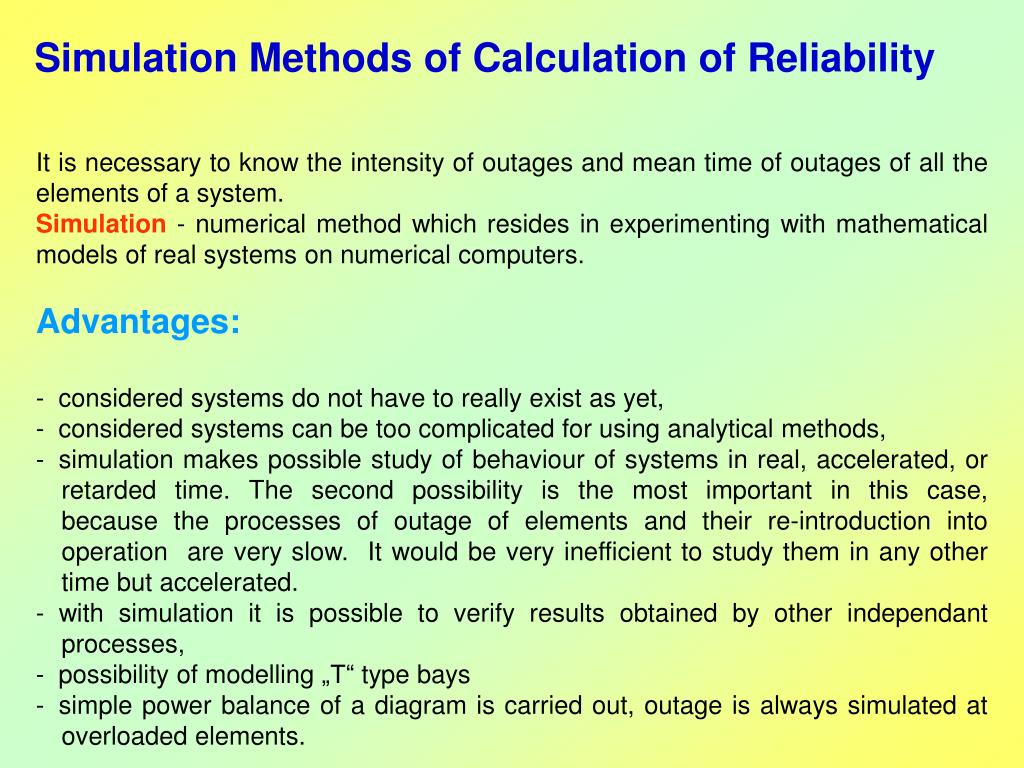 Simulation Methods of Calculation of Reliability • It is necessary to know the intensity of outages and mean time of outages of all the elements of a system. • Simulation - numerical method which resides in experimenting with mathematical models of real systems on numerical computers. • Advantages: • - considered systems do not have to really exist as yet, • considered systems can be too complicated for using analytical methods, • simulation makes possible study of behaviour of systems in real, accelerated, or retarded time. The second possibility is the most important in thiscase, because the processes of outage of elementsand their re-introduction into operation are very slow. It would be very inefficient to study them in any other time but accelerated. • with simulation it is possible to verify results obtained by other independant processes, • possibility of modelling „T“ type bays • simple power balance of a diagram is carried out, outage is always simulated at overloaded elements.