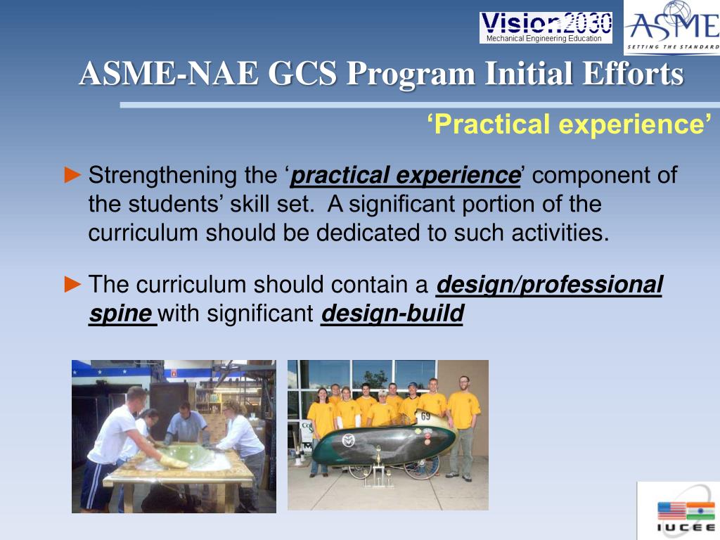 ASME-NAE GCS Program Initial Efforts ‘Practical experience’ • Strengthening the ‘practical experience’ component of the students’ skill set. A significant portion of the curriculum should be dedicated to such activities. • The curriculum should contain a design/professional spine with significant design-build
