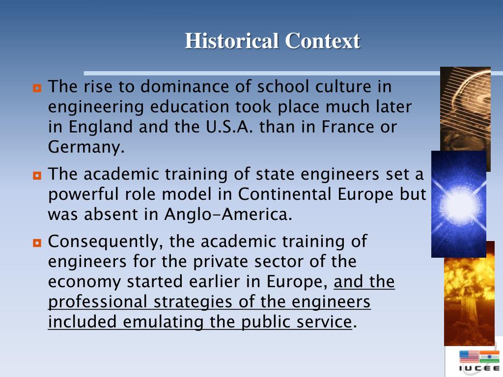 Historical Context • The rise to dominance of school culture in engineering education took place much later in England and the U.S.A. than in France or Germany. • The academic training of state engineers set a powerful role model in Continental Europe but was absent in Anglo-America. • Consequently, the academic training of engineers for the private sector of the economy started earlier in Europe, and the professional strategies of the engineersincluded emulating the public service.