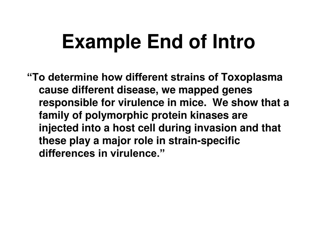 Example End of Intro “To determine how different strains of Toxoplasma cause different disease, we mapped genes responsible for virulence in mice. We show that a family of polymorphic protein kinases are injected into a host cell during invasion and that these play a major role in strain-specific differences in virulence.”
