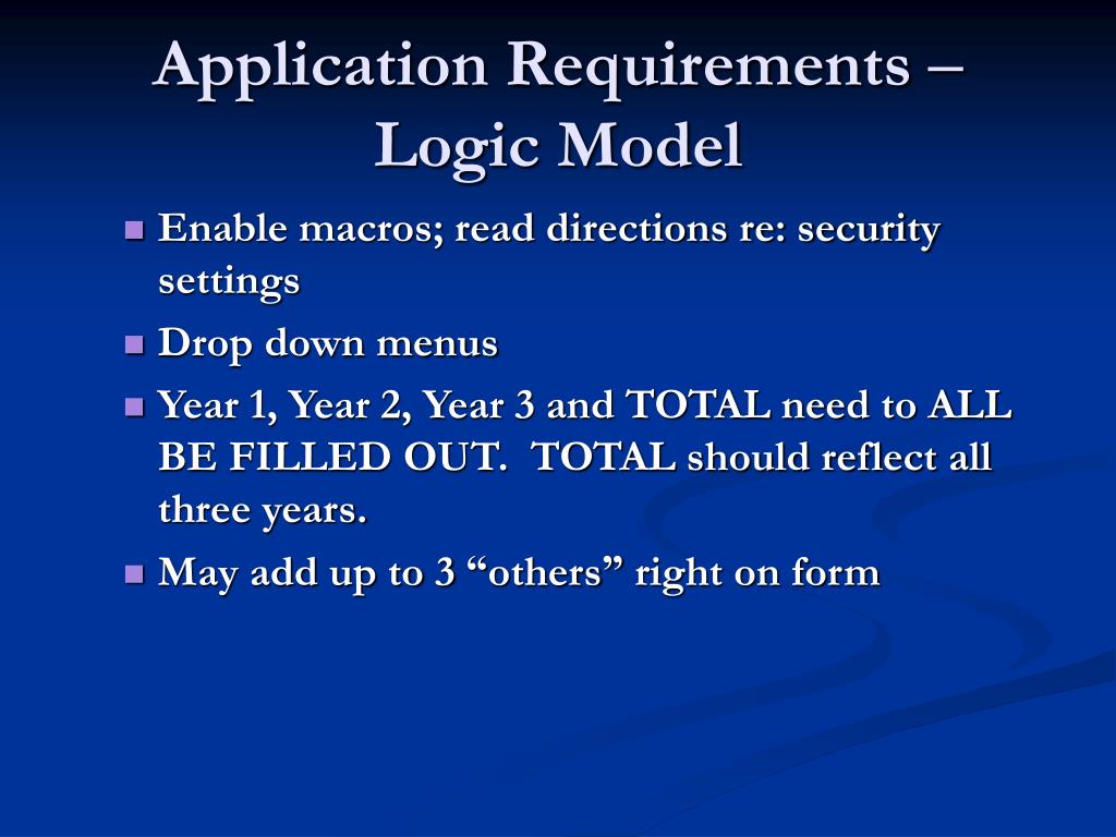 Application Requirements – Logic Model • Enable macros; read directions re: security settings • Drop down menus • Year 1, Year 2, Year 3 and TOTAL need to ALL BE FILLED OUT. TOTAL should reflect all three years. • May add up to 3 “others” right on form