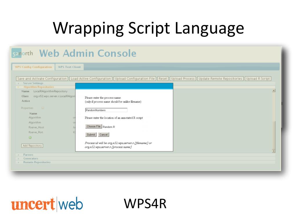 WPS4R http://52north.org/wps4r Expose arbitrary R scripts via WPS Variety of input and output formats • Under development! • Vector, Raster, … Current Use Cases: Reproducibility, Clients/Usability, Publishing