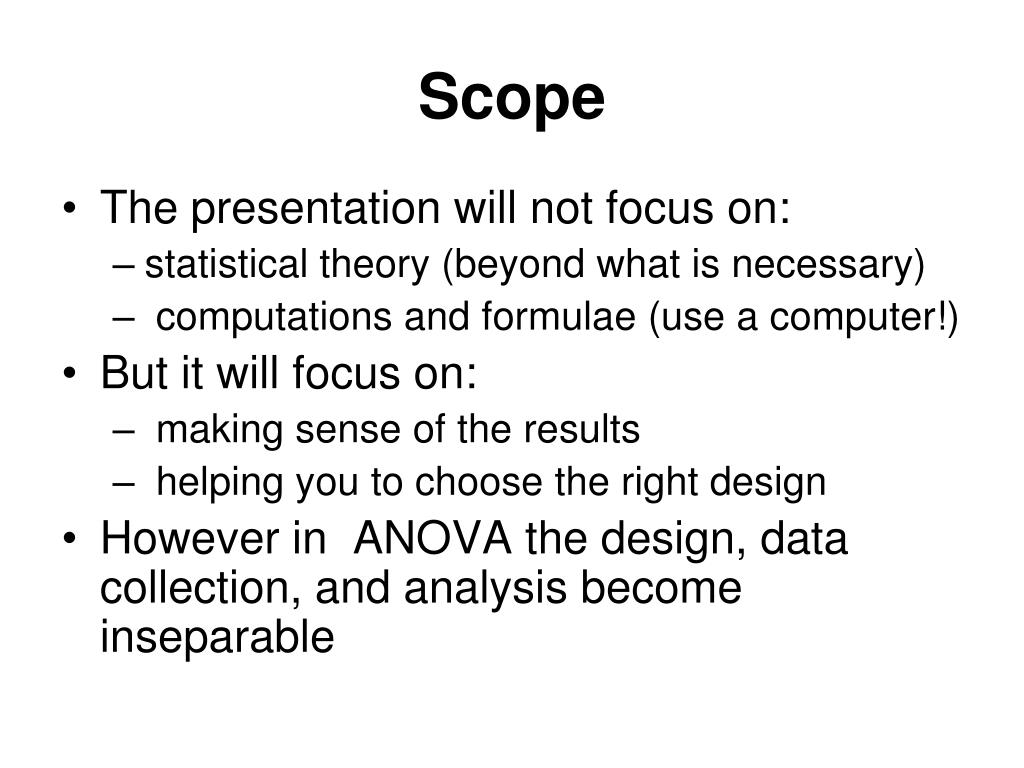 Scope • The presentation will not focus on: • statistical theory (beyond what is necessary) • computations and formulae (use a computer!) • But it will focus on: • making sense of the results • helping you to choose the right design • However in ANOVA the design, data collection, and analysis become inseparable