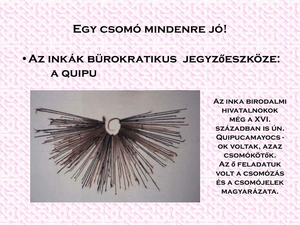 Egy csomó mindenre jó! • Az inkák bürokratikus jegyzőeszköze: a quipu Az inka birodalmi hivatalnokok még a XVI. században is ún. Quipucamayocs - ok voltak, azaz csomókötők. Az ő feladatuk volt a csomózás és a csomójelek magyarázata.