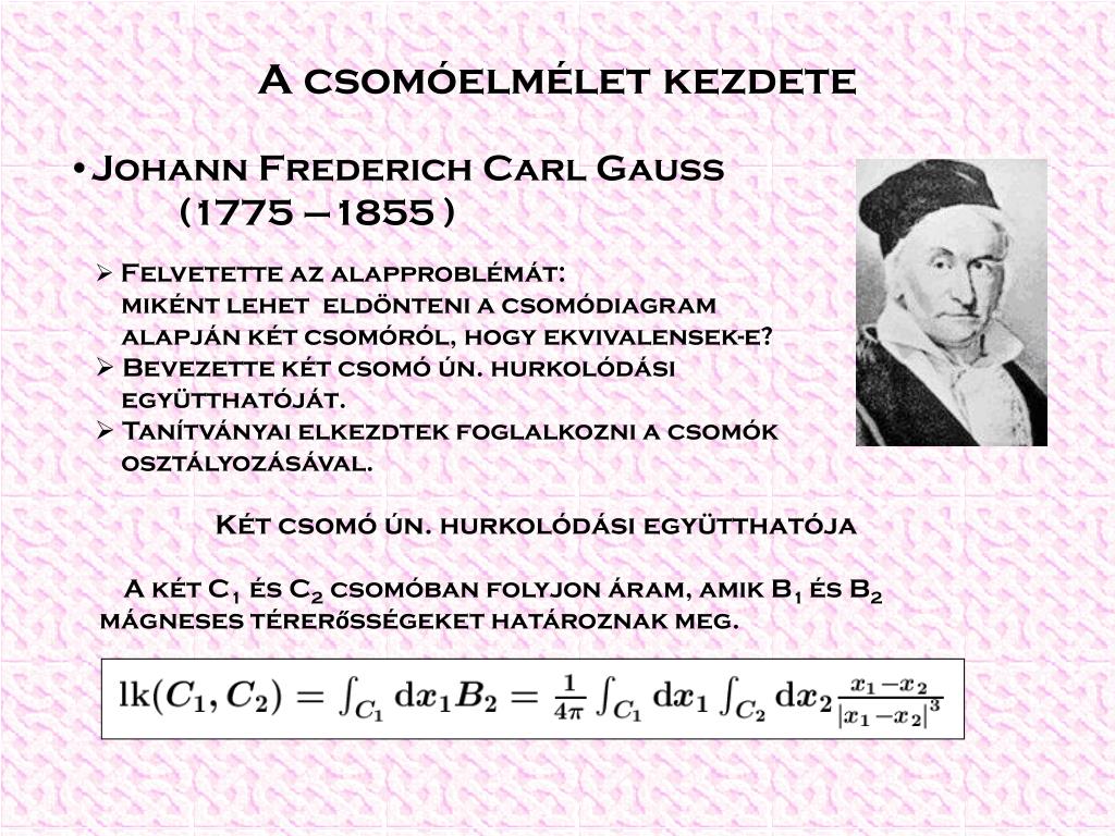 A csomóelmélet kezdete • Johann Frederich Carl Gauss (1775 –1855 ) • Felvetette az alapproblémát: miként lehet eldönteni a csomódiagram alapjánkét csomóról, hogy ekvivalensek-e? • Bevezette két csomó ún. hurkolódási együtthatóját. • Tanítványai elkezdtek foglalkozni a csomók osztályozásával. Két csomó ún. hurkolódási együtthatója A két C1 és C2csomóban folyjon áram, amik B1 és B2 mágneses térerősségeket határoznak meg.