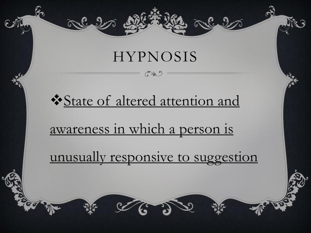 Hypnosis • State of altered attention and awareness in which a person is unusually responsive to suggestion