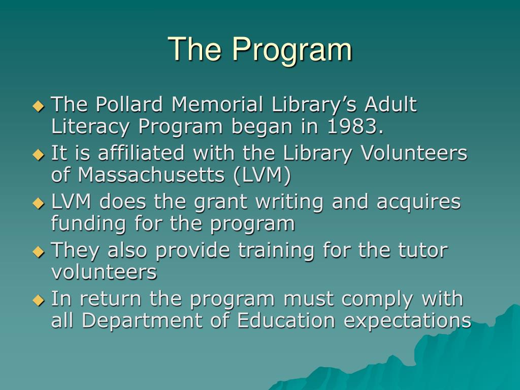Pollard Memorial Library Adult Literacy Program. The Program. The Pollard Memorial Library’s Adult Literacy Program began in 1983. It is affiliated with the Library Volunteers of Massachusetts (LVM) LVM does the grant writing and acquires funding for the program
