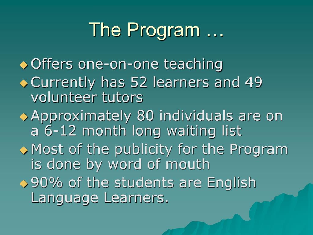 The Program … • Offers one-on-one teaching • Currently has 52 learners and 49 volunteer tutors • Approximately 80 individuals are on a 6-12 month long waiting list • Most of the publicity for the Program is done by word of mouth • 90% of the students are English Language Learners.
