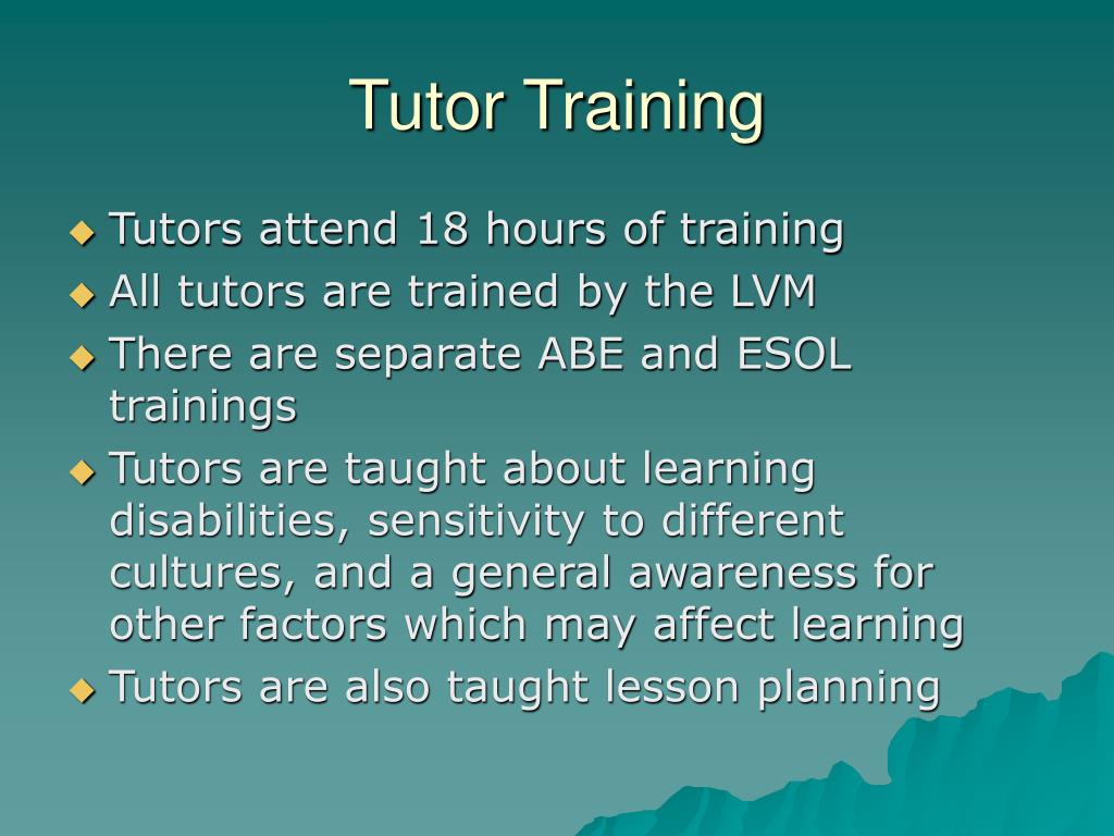 Tutor Training • Tutors attend 18 hours of training • All tutors are trained by the LVM • There are separate ABE and ESOL trainings • Tutors are taught about learning disabilities, sensitivity to different cultures, and a general awareness for other factors which may affect learning • Tutors are also taught lesson planning