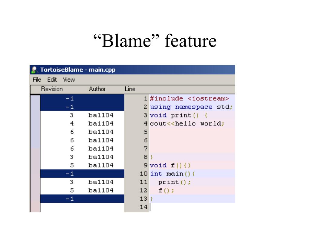 Finding who changed who to blame This feature isn’t only to “get someone in trouble”. If you have a conflict, this will tell you who changed each line of code in the file. That way you can communicate with them to resolve the conflict.