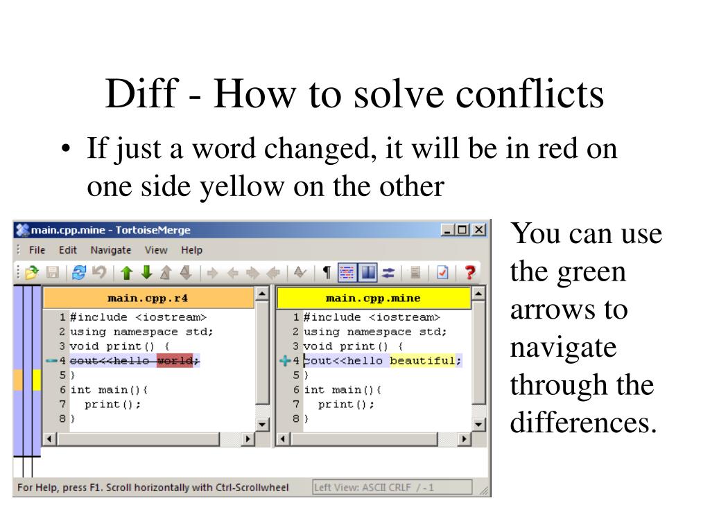 Diff - How to solve conflicts • If just a word changed, it will be in red on one side yellow on the other You can use the green arrows to navigate through the differences.