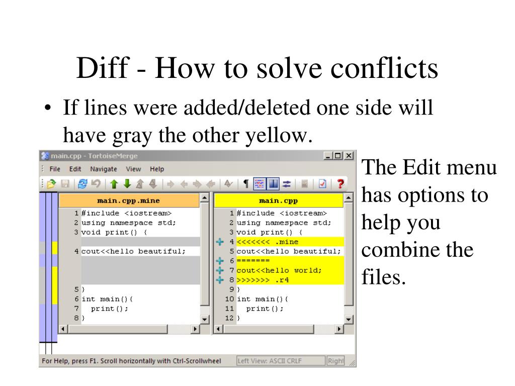Diff - How to solve conflicts • If lines were added/deleted one side will have gray the other yellow. The Edit menu has options to help you combine the files.