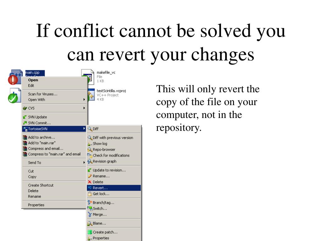 If conflict cannot be solved you can revert your changes This will only revert the copy of the file on your computer, not in the repository.