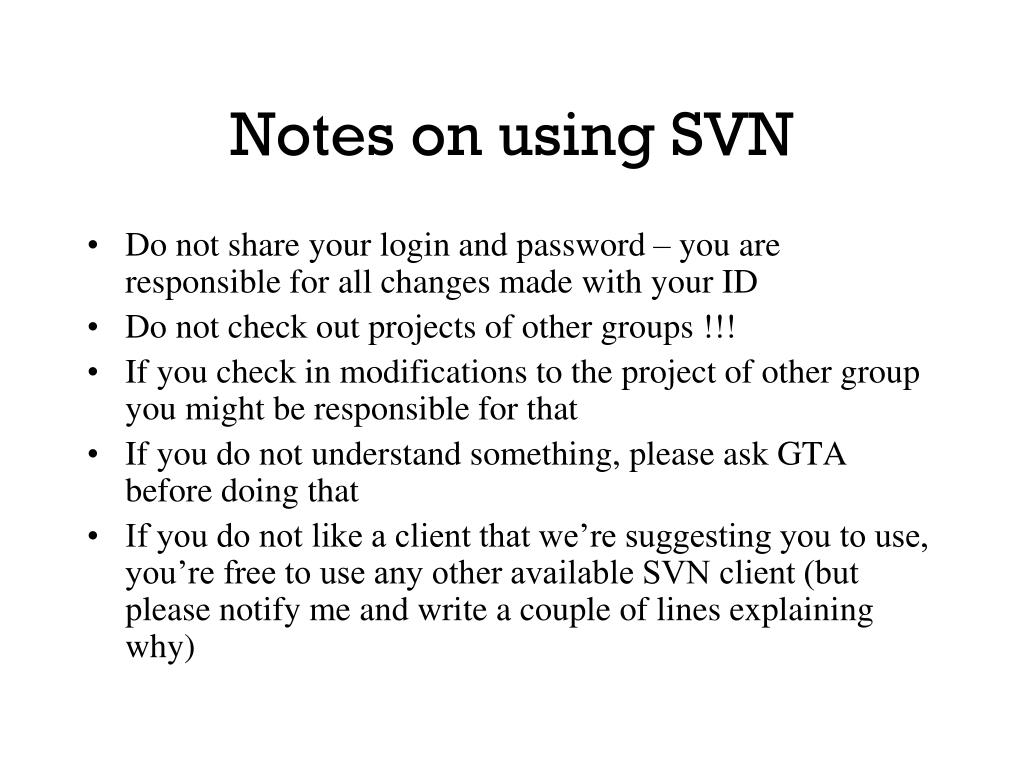 Notes on using SVN • Do not share your login and password – you are responsible for all changes made with your ID • Do not check out projects of other groups !!! • If you check in modifications to the project of other group you might be responsible for that • If you do not understand something, please ask GTA before doing that • If you do not like a client that we’re suggesting you to use, you’re free to use any other available SVN client (but please notify me and write a couple of lines explaining why)