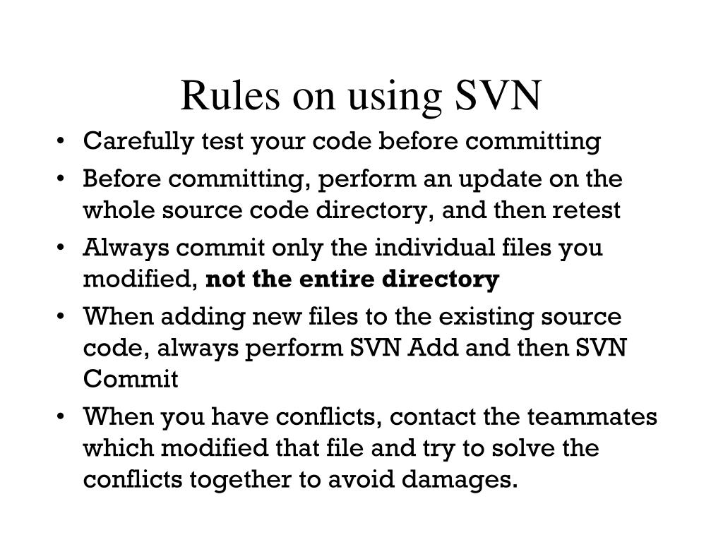 Rules on using SVN • Carefully test your code before committing • Before committing, perform an update on the whole source code directory, and then retest • Always commit only the individual files you modified, not the entire directory • When adding new files to the existing source code, always perform SVN Add and then SVN Commit • When you have conflicts, contact the teammates which modified that file and try to solve the conflicts together to avoid damages.