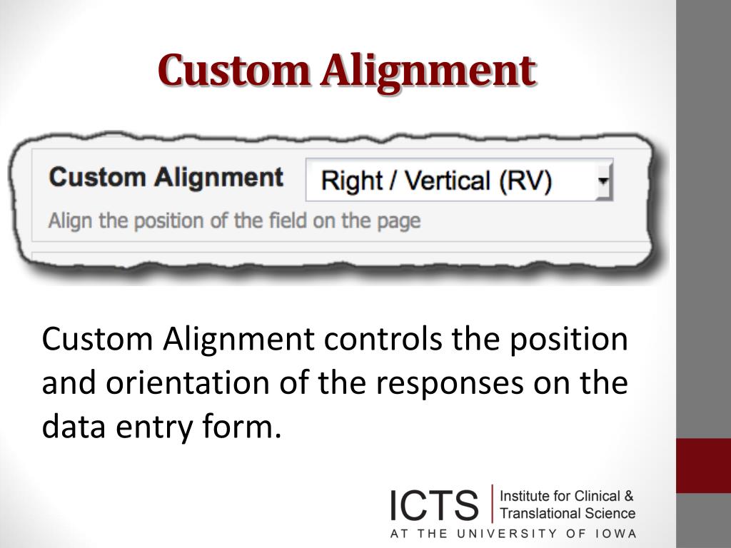Custom Alignment Custom Alignment controls the position and orientation of the responses on the data entry form.