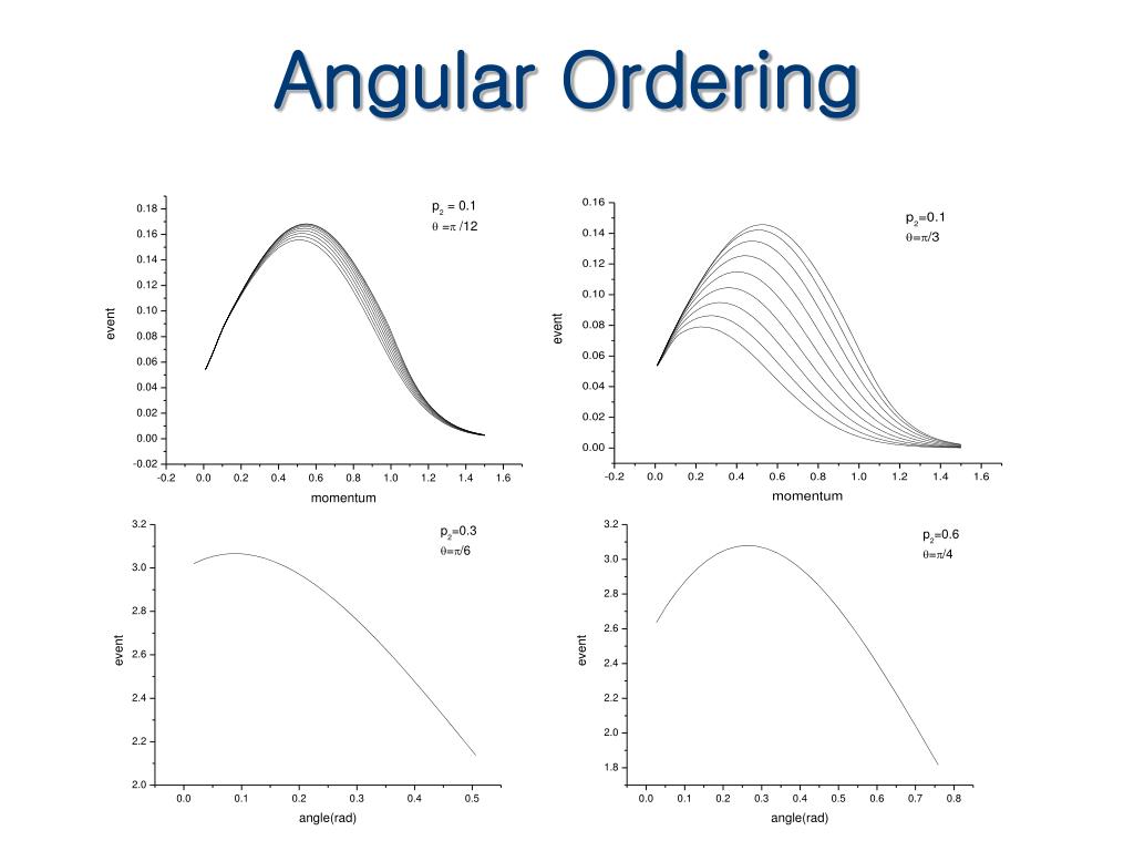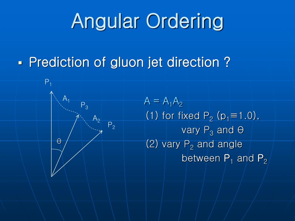 P1 A1 P3 A2 P2 θ Angular Ordering • Prediction of gluon jet direction ? A = A1A2 (1) for fixed P2 (p1≡1.0), vary P3 and θ (2) vary P2 and angle between P1 and P2