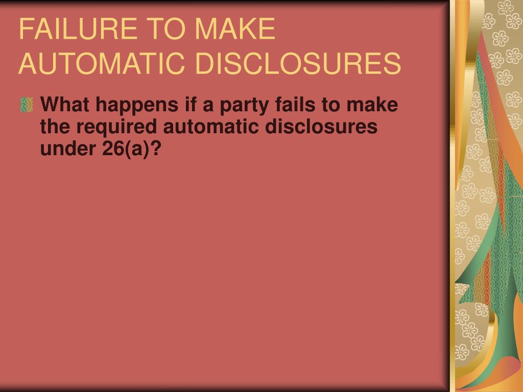 FAILURE TO MAKE AUTOMATIC DISCLOSURES • What happens if a party fails to make the required automatic disclosures under 26(a)?