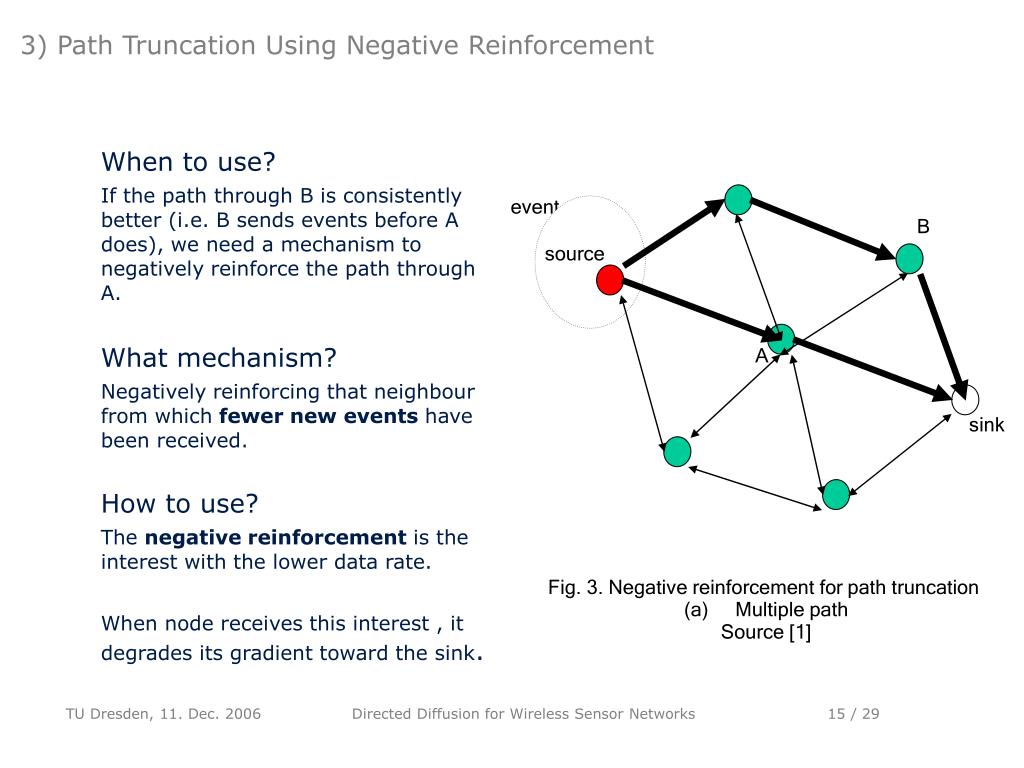 3) Path Truncation Using Negative Reinforcement event B source sink • When to use? • If the path through B is consistently better (i.e. B sends events before A does), we need a mechanism to negatively reinforce the path through A. • What mechanism? • Negatively reinforcing that neighbour from which fewer new events have been received. • How to use? • The negative reinforcement is the interest with the lower data rate. • When node receives this interest , it degrades its gradient toward the sink. A Fig. 3. Negative reinforcement for path truncation Multiple path Source [1] Directed Diffusion for Wireless Sensor Networks