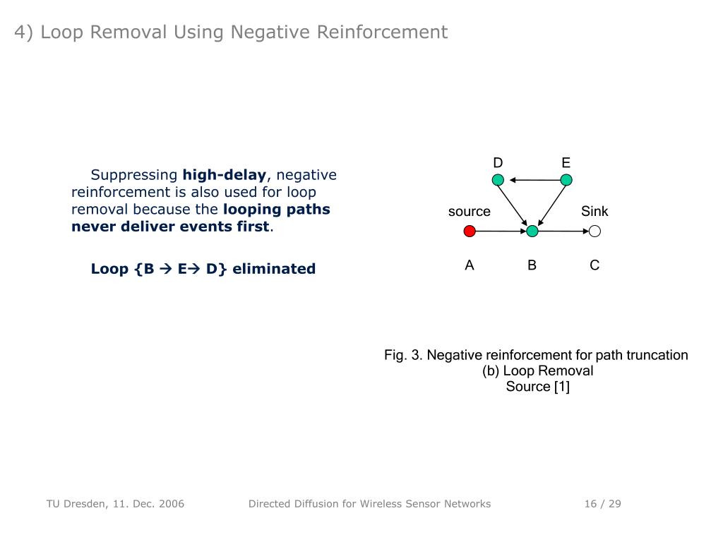 4) Loop Removal Using Negative Reinforcement E D source Sink A B C • Suppressing high-delay, negative reinforcement is also used for loop removal because the looping paths never deliver events first. • Loop {B E D} eliminated Fig. 3. Negative reinforcement for path truncation (b) Loop Removal Source [1] Directed Diffusion for Wireless Sensor Networks