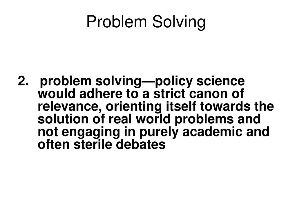 Problem Solving 2. problem solving—policy science would adhere to a strict canon of relevance, orienting itself towards the solution of real world problems and not engaging in purely academic and often sterile debates
