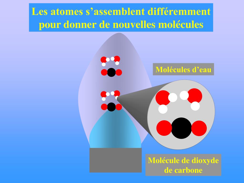 Les atomes s’assemblent différemment pour donner de nouvelles molécules Molécules d’eau Molécule de dioxyde de carbone