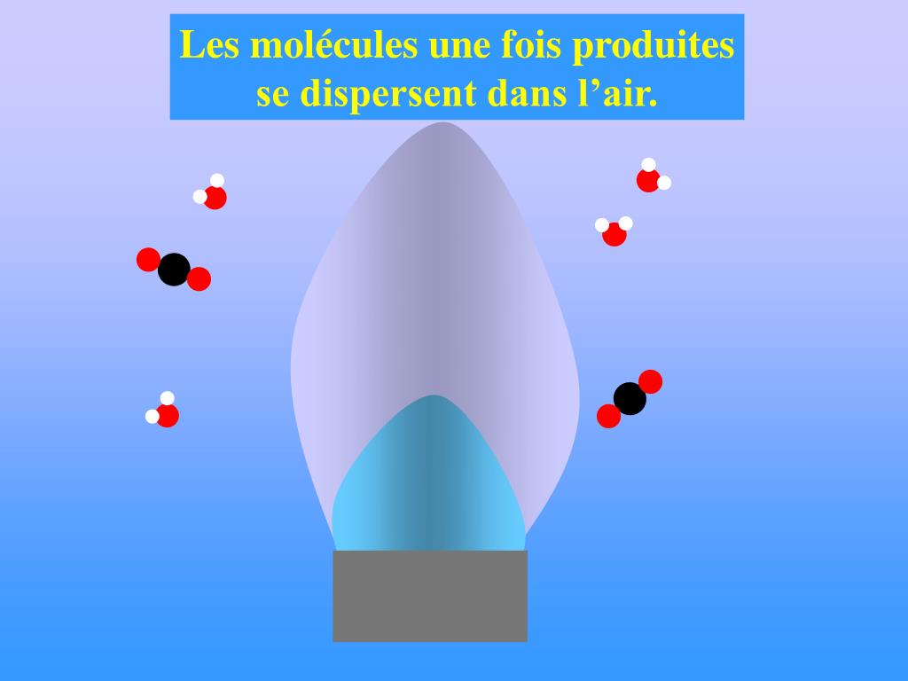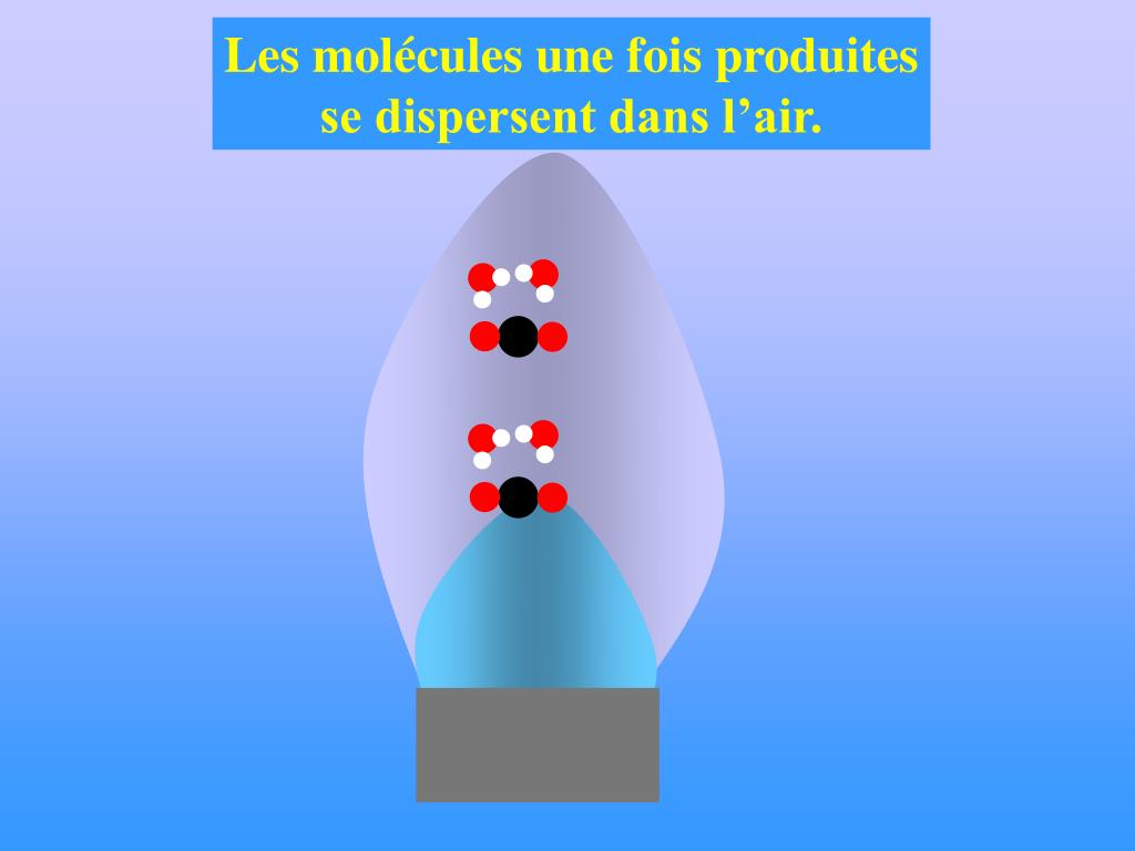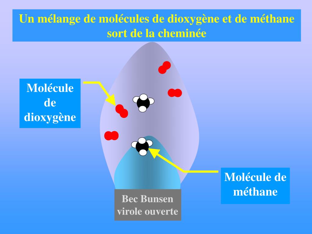 La combustion du méthane dans l’air. Un mélange de molécules de dioxygène et de méthane sort de la cheminée. Molécule de dioxygène. Molécule de méthane. Bec Bunsen virole ouverte. Un mélange de molécules de dioxygène et de méthane sort de la cheminée.