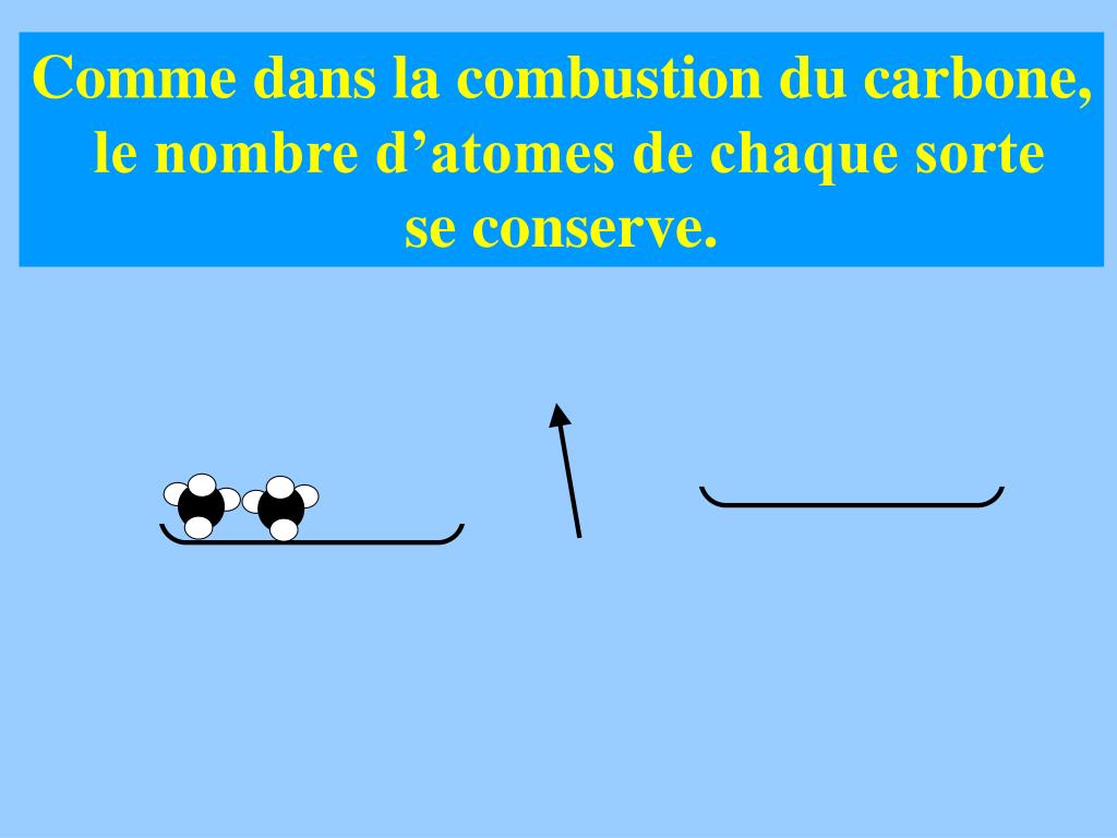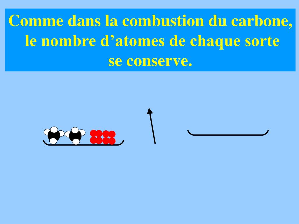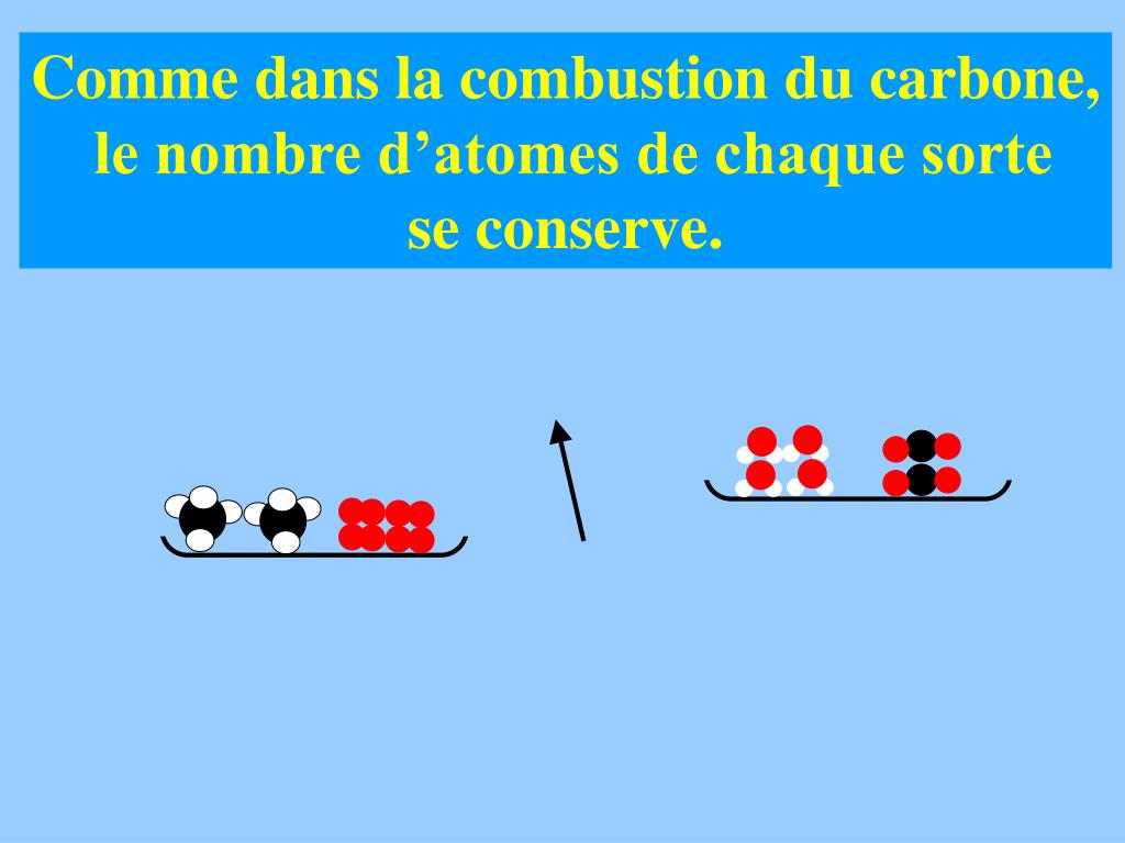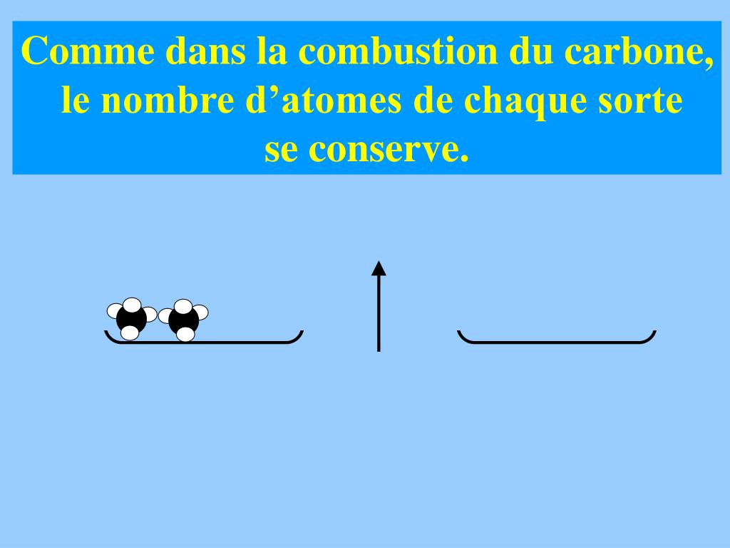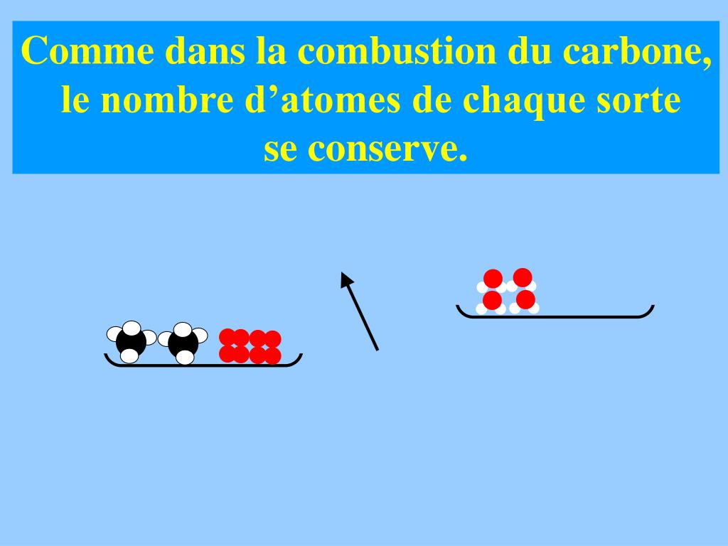 Comme dans la combustion du carbone, le nombre d’atomes de chaque sorte se conserve.