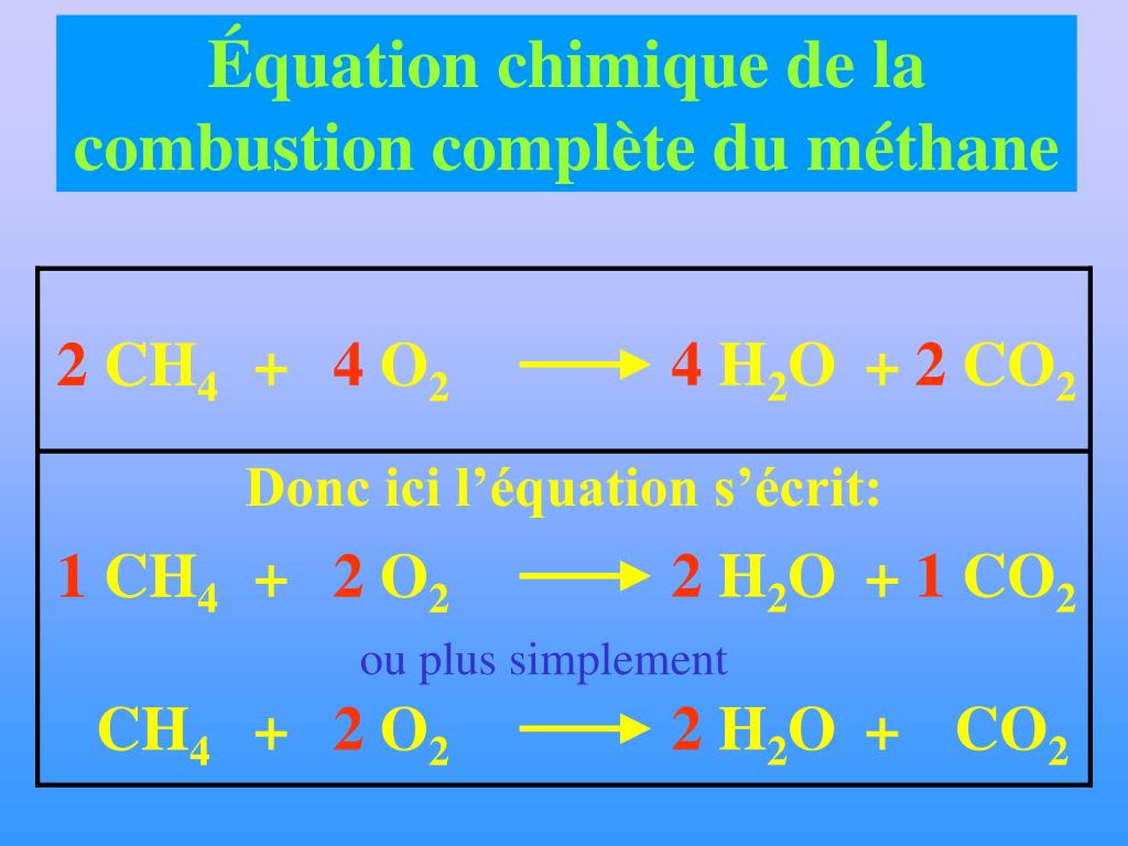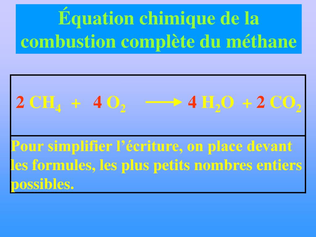 Équation chimique de la combustion complète du méthane 4 H2O 2 CO2 2 CH4 + 4 O2 + 2 H2O 1 CO2 1 CH4 + 2 O2 + ou plus simplement 2 H2O CO2 CH4 + 2 O2 +