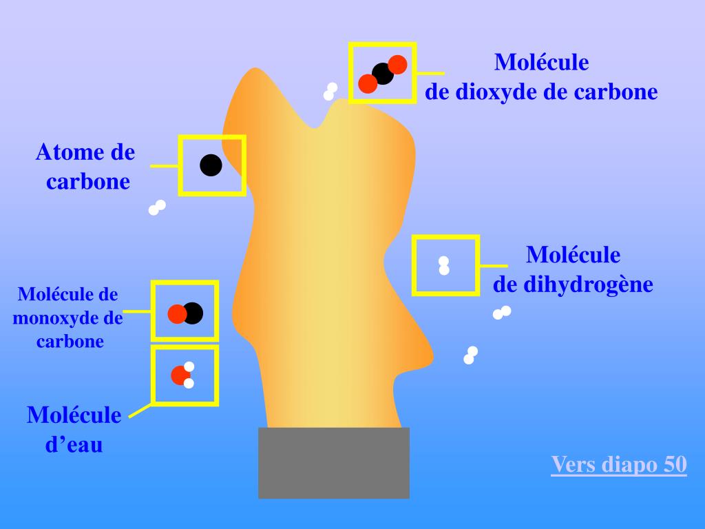 Molécule de dioxyde de carbone Atome de carbone Molécule de dihydrogène Molécule de monoxyde de carbone Molécule d’eau Vers diapo 50