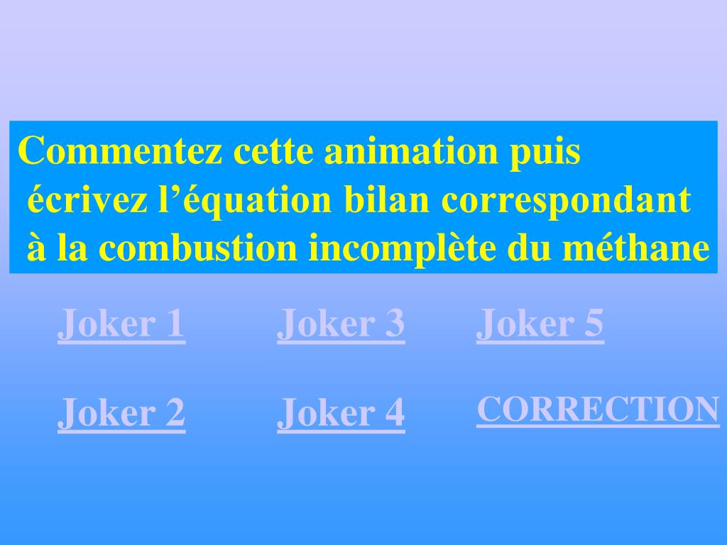 Commentez cette animation puis écrivez l’équation bilan correspondant à la combustion incomplète du méthane Joker 1 Joker 3 Joker 5 Joker 2 Joker 4 CORRECTION